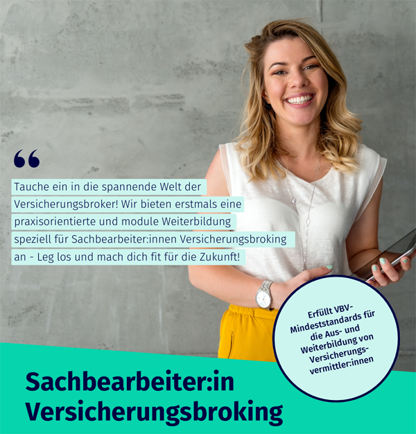 Die beru­fliche Weit­er­bil­dung zum Sachbearbeiter:in Ver­sicherungs­broking ermöglicht dir die prak­tis­che Anwen­dung von Grund­la­gen im Ver­sicherungswe­sen erst­ma­lig mit speziellem Fokus auf die Welt der Bro­ker. Während der Aus­bil­dung erhältst du Ein­blicke in den Ver­sicherungs­markt, die Auf­gaben der Bro­ker und die ver­schiede­nen Ver­sicherungss­parten. Du wirst in der Erstel­lung und Bew­er­tung von Ver­sicherungsver­gle­ichen, der Analyse und Kon­trolle von Poli­cen und Leis­tungsabrech­nun­gen sowie der Erstel­lung von Präsen­ta­tio­nen geschult. Zudem lernst du die wichtig­sten rechtlichen Grund­la­gen und Haf­tungsrisiken ken­nen, die für Bro­ker von Bedeu­tung sind. Diese prax­isori­en­tierte Weit­er­bil­dung ermöglicht es dir, das Erlernte in real­ität­sna­hen Szenar­ien anzuwen­den, wodurch du opti­mal auf deine zukün­fti­gen Auf­gaben bei einem Ver­sicherungs­bro­ker, Ver­sicher­er oder anderen Branchenak­teuren vor­bere­it­et wirst. Absol­ven­ten find­en sowohl während als auch nach der Aus­bil­dung vielfältige Beschäf­ti­gungsmöglichkeit­en in der Branche.